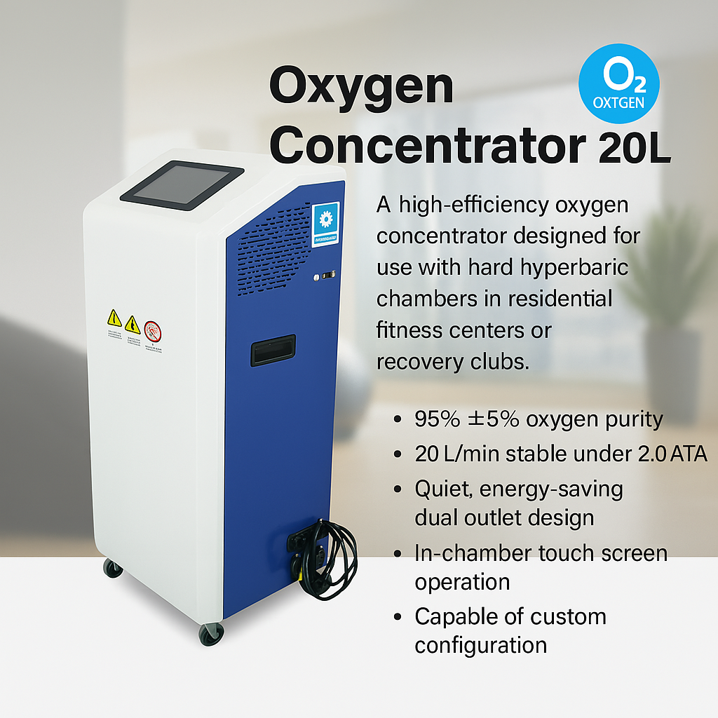This 20L high-flow oxygen concentrator is specifically engineered for use with hard-shell hyperbaric chambers accommodating one or two users.